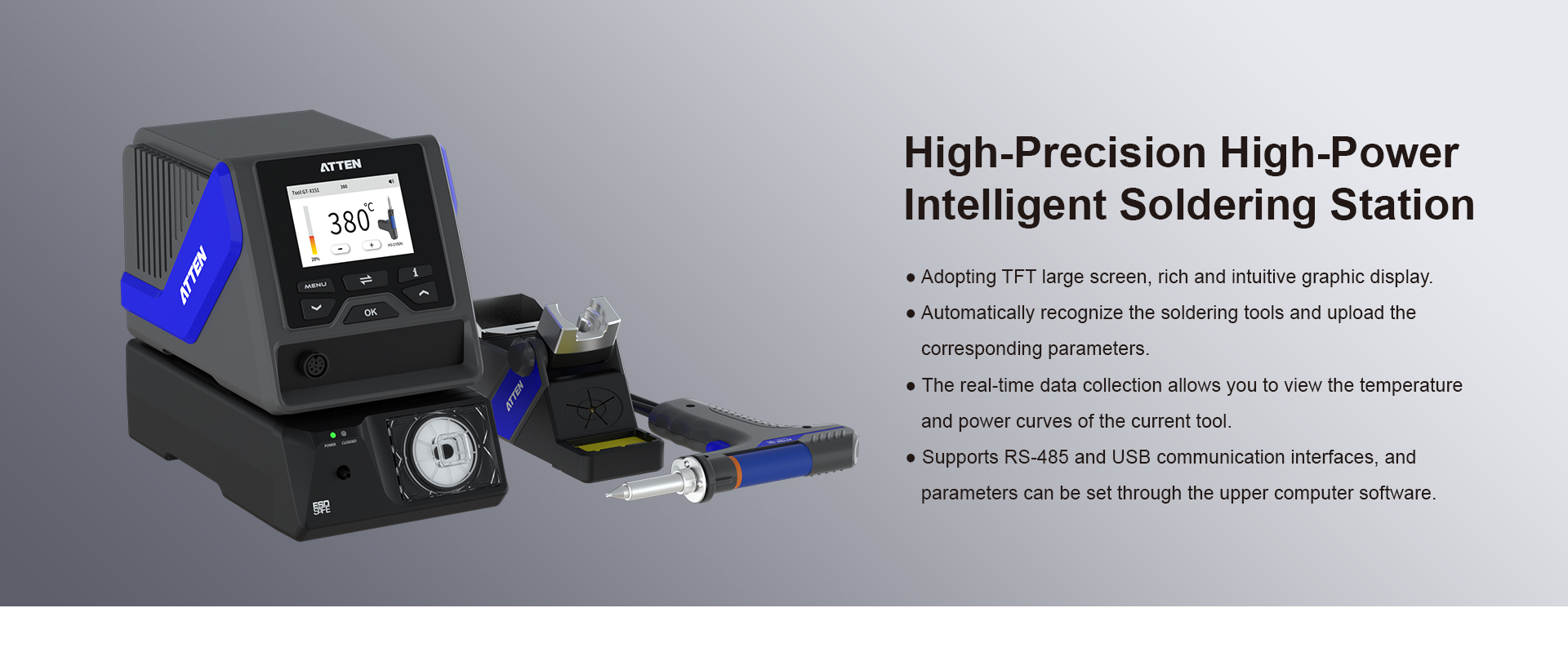 The GT-6301 intelligent soldering station is engineered to meet the demands of engineering teams and technicians requiring exceptional precision and ease of use. Designed to support complex soldering tasks, this ATTEN soldering tool enhances application accuracy and process repeatability. Its user-oriented interface allows seamless integration into production lines or R&D labs focused on electronics assembly and prototyping. This solution targets professional users who require consistent quality and reliability from the best professional soldering iron while maintaining workflow efficiency in high-volume or intricate soldering environments.